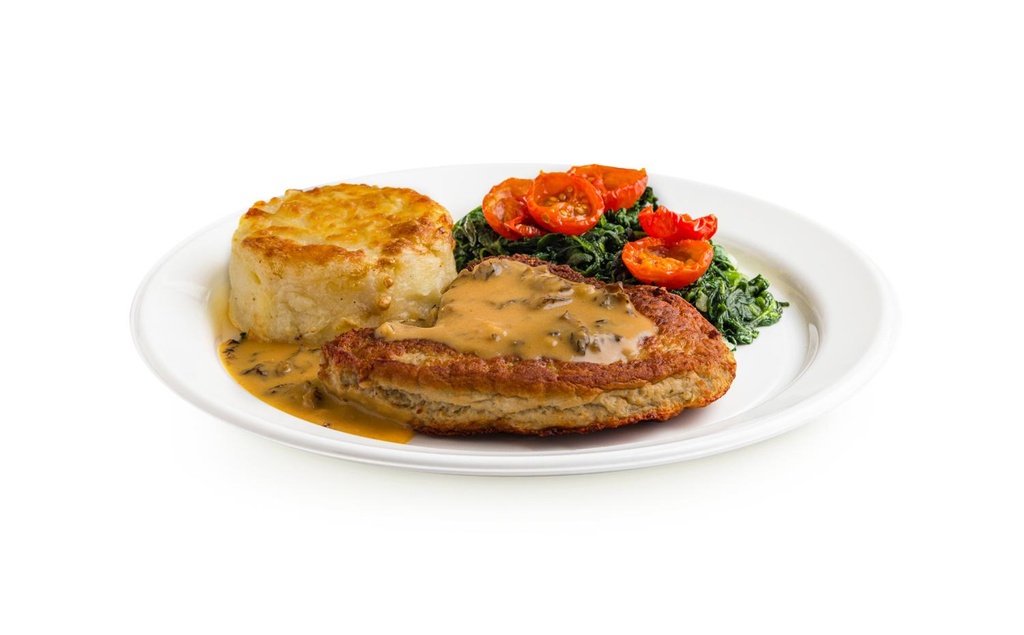 No. 310 Kalbssteak Pojarski: Fleischerzeugnis 30% (Kalbfleisch 86% (Schweiz), Wasser, Paniermehl (enthält Weizen*), Kochsalz, Würzmischung, Gewürze, Glucosesirup, Milchzucker,* Geschmacksverstärker: Mononatriumglutamat, Antioxidationsmittel: Ascorbinsäure und Natriumascorbat, Aroma), Kartoffelzubereitung 23% (Kartoffeln, Sauerrahm*, Rahm*, Vollmilch*, Gouda (Käse*), modifizierte Stärke, Sonnenblumenöl, Gewürze (enthalten Sellerie*), Knoblauch), Wasser, Blattspinat 15%, Cherrytomaten getrocknet, Morcheln (aus getrockneten Pilzen) 2.5%, Butter,* Rapsöl, Wein, Zwiebeln, Rahm* 1%, modifizierte Stärke, natürliches Aroma (enthält Weizen*), Streuwürze, Knoblauch, Kochsalz, Gewürze, Geschmacksverstärker: Mononatriumglutamat, Milchprotein* (enthält Milchzucker*), Reisstärke, Caramelzuckersirup, GewürzextrakteNährwerte